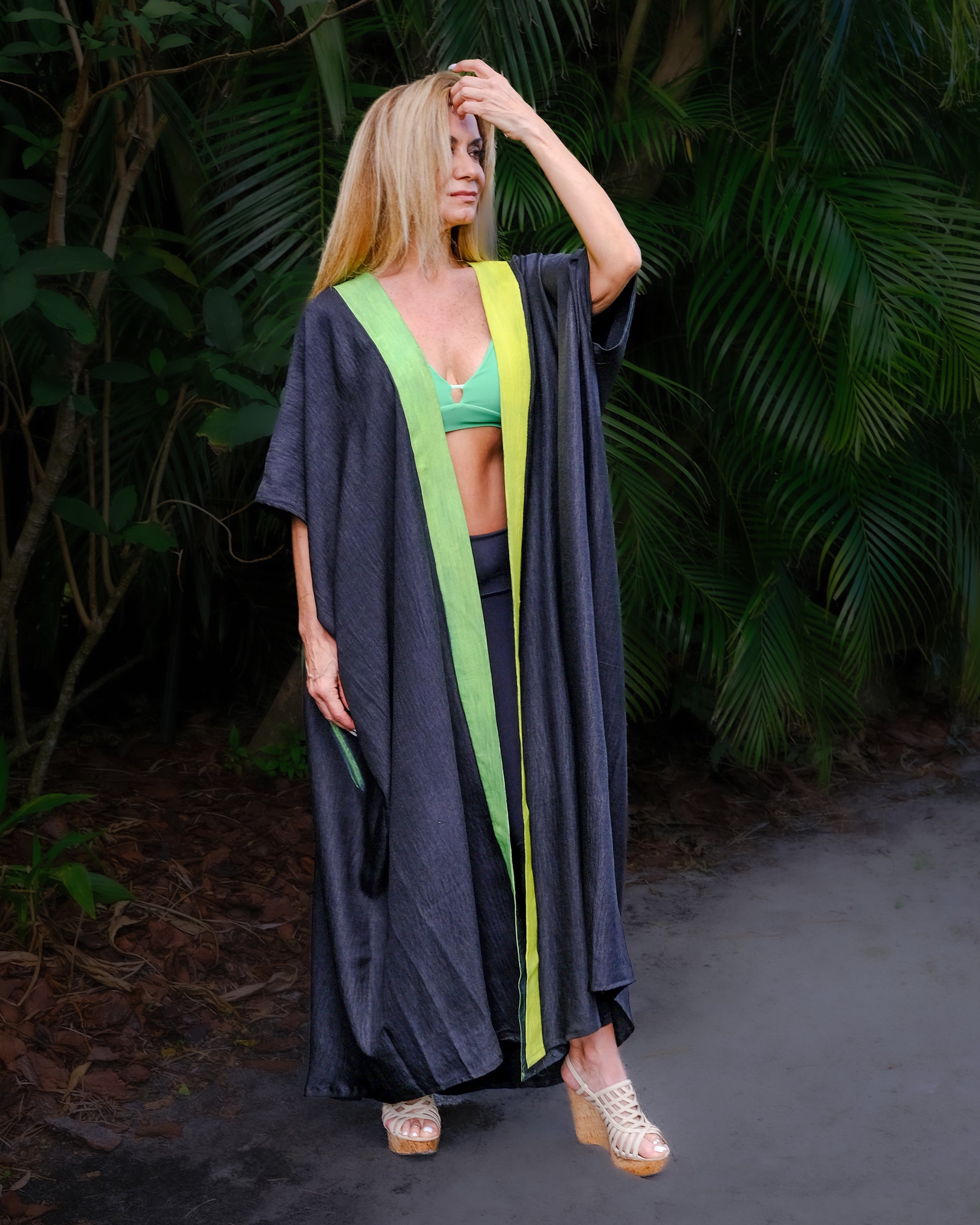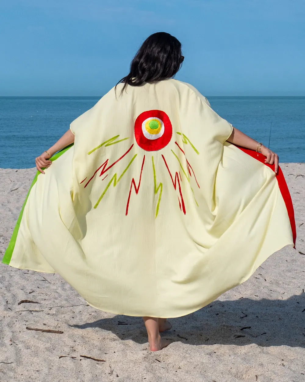 Radiating energy and color, this lightweight kaftan features a bold embroidered sunburst design in vibrant red, lime and yellow It's flowy silhouette is perfect for beach days, sunset strolls or statement resort wear