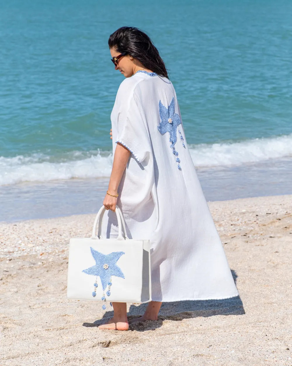 Lightweight breathable gauze ,drapes beautifully, perfect for warm days .The hand crocheted starfish motif with shimmering beadwork adds a unique coastal touch